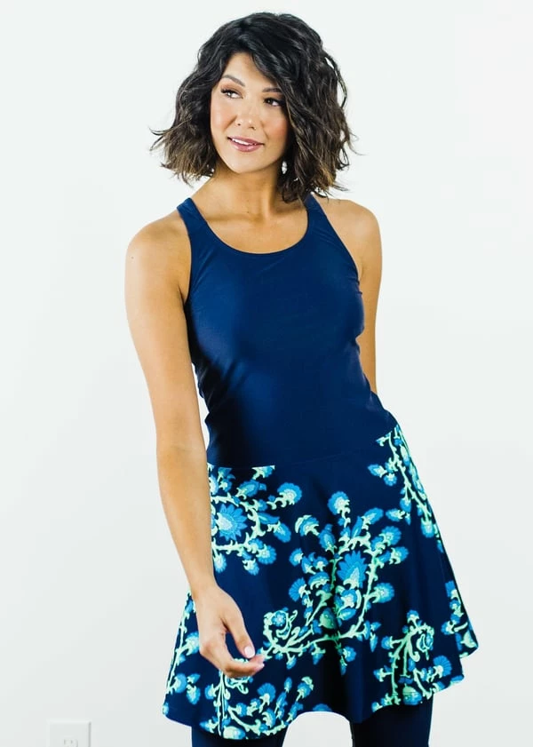 The Emily Swim Dress is the perfect cute and comfy option for a fun and relaxing day in the sun. It features a sleeveless racerback neckline with a contrast printed skirt. Pair it with your favorite swim bottoms to complete the look.