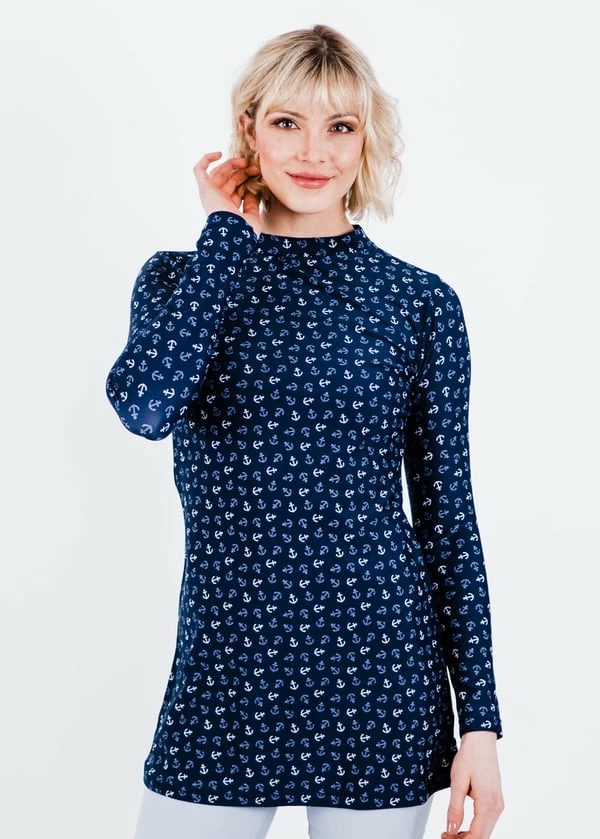 The Jenna Swim Tunic is a long sleeved swim tunic that features a raised collar and a slightly looser fit for easy and comfortable wear all day long! This tunic is long enough to cover the rear and is perfect for all kinds of activities!