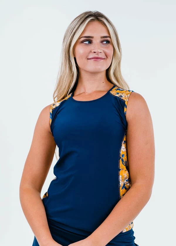 Comfort, style, and sun protection meet seamlessly with the Loose Fit Maya Swim Top. A round neckline, relaxed fit, and contrasting side panels create a slimming effect. Sold as top only. Pair with your favorite swim bottom to complete the look.
