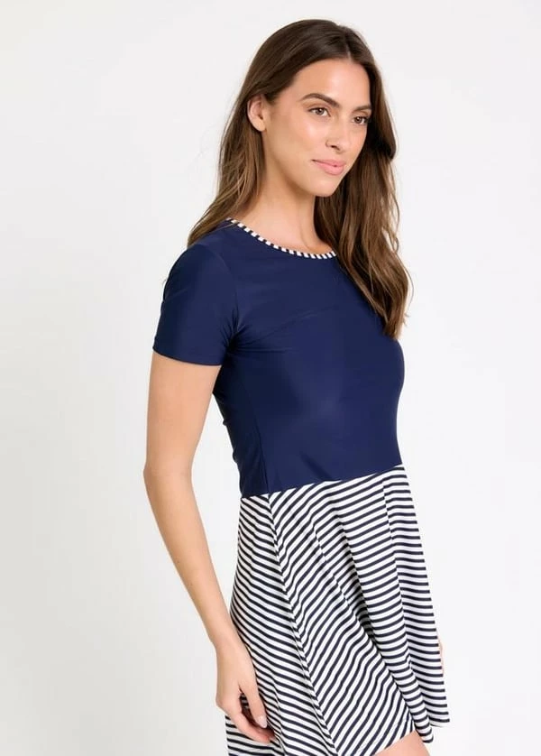 This fun and modest swim dress is the perfect thing to wear to the beach! Look cute and fashionable in our multitude of prints and patterns but stay modestly covered. This product does not have a built in bra.